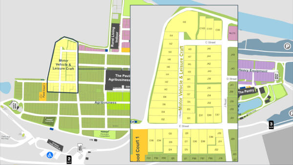 On the Fieldays map, the yellow area indicates the Motor Vehicle and Leisure Craft area.