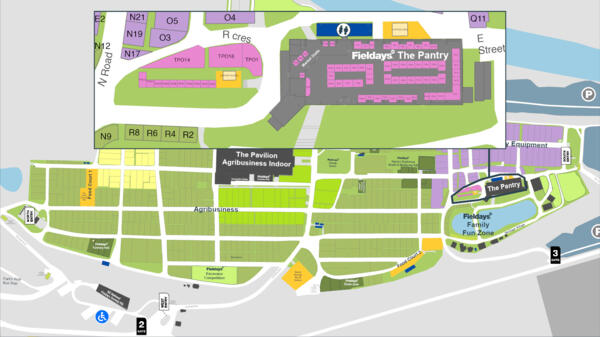 On the Fieldays map, the pink sites on a grey background indicate The Pantry's Indoor sites, including Market Stalls, while the pink sites alongside indicate The Pantry Outdoor area, including Mini Marquees.